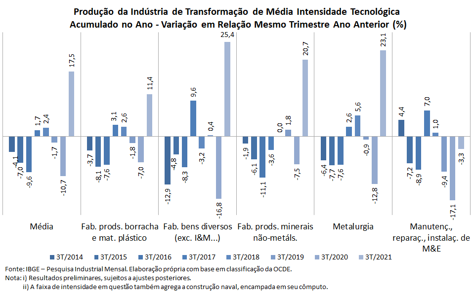 O conjunto de atividades da indústria de transformação de média-baixa intensidade tecnológica retrocedeu 7,7% no contraponto entre meses de setembro, caindo 5,6% no terceiro trimestre. Tais performances arrefeceram os desempenhos nas demais bases de comparação: em janeiro-setembro, o crescimento foi de 0,8%, enquanto, em doze meses, foi de 0,9%. Esse desempenho em doze meses aquém daqueles das demais faixas de intensidade tecnológica decorreu de parte importante dessas atividades terem sido menos afetadas negativamente pela pandemia em 2020.