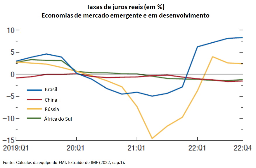 De forma geral, as taxas de básicas nominais estão acima do patamar pré-pandemia tanto nas EAs como nas EMDEs. Em contrapartida, como na maioria dos países a alta dessas taxas foi menor do que o aumento da inflação, as taxas reais continuam abaixo do patamar pré-pandemia.