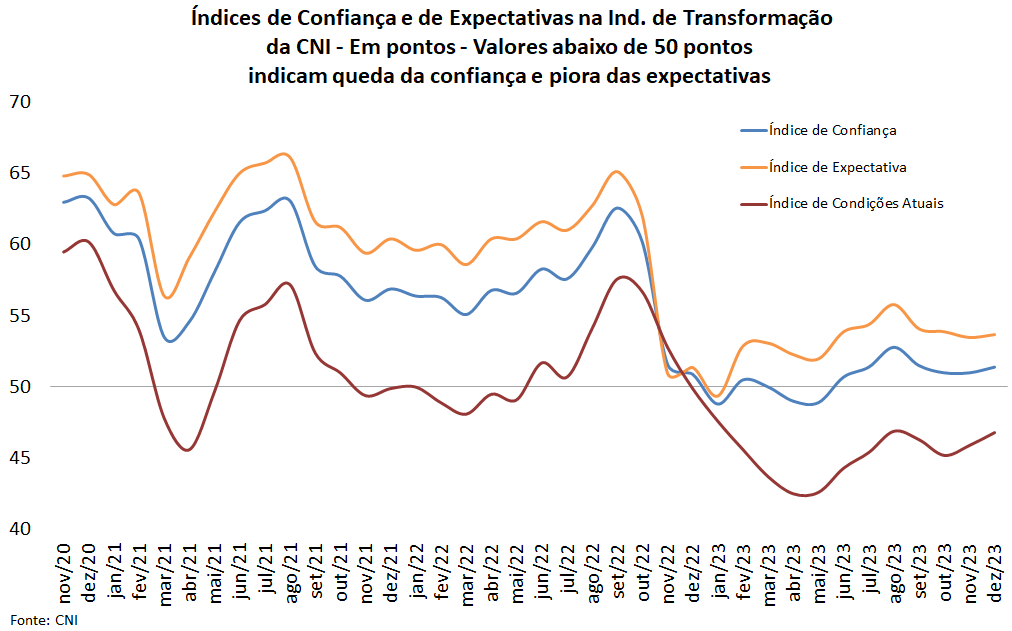 O Índice de Confiança do Empresário da Indústria Geral da CNI, que havia assinalado pequena queda entre os meses de out/23 (50,5 pontos) e nov/23 (50,4 pontos), assinalou alta em dez/23, atingindo 51,0 pontos, ficando na zona de otimismo. Cabe lembrar que valores abaixo da marca dos 50 pontos indicam pessimismo e acima dela, otimismo do empresariado industrial.