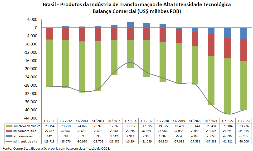 No quarto trimestre, o saldo dos bens das indústrias de alta intensidade apresentou saldo deficitário de US$ 9,4 bilhões, uma diferença de US$ 530 milhões frente ao déficit do mesmo trimestre de 2022. Suas exportações tiveram variação de -1,0%, ficando em US$ 1,6 bilhão. As importações caíram 4,6%, parando em US$ 11,5 bilhões.
