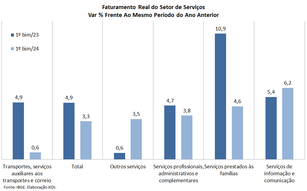O setor de serviços, por sua vez, foi o único a reduzir seu dinamismo no contraste entre as duas entradas de ano em tela. Seu faturamento real se expandiu no 1º bim/24, mas em um ritmo menor do que em jan-fev/23: +3,3% ante +4,9%, respectivamente.