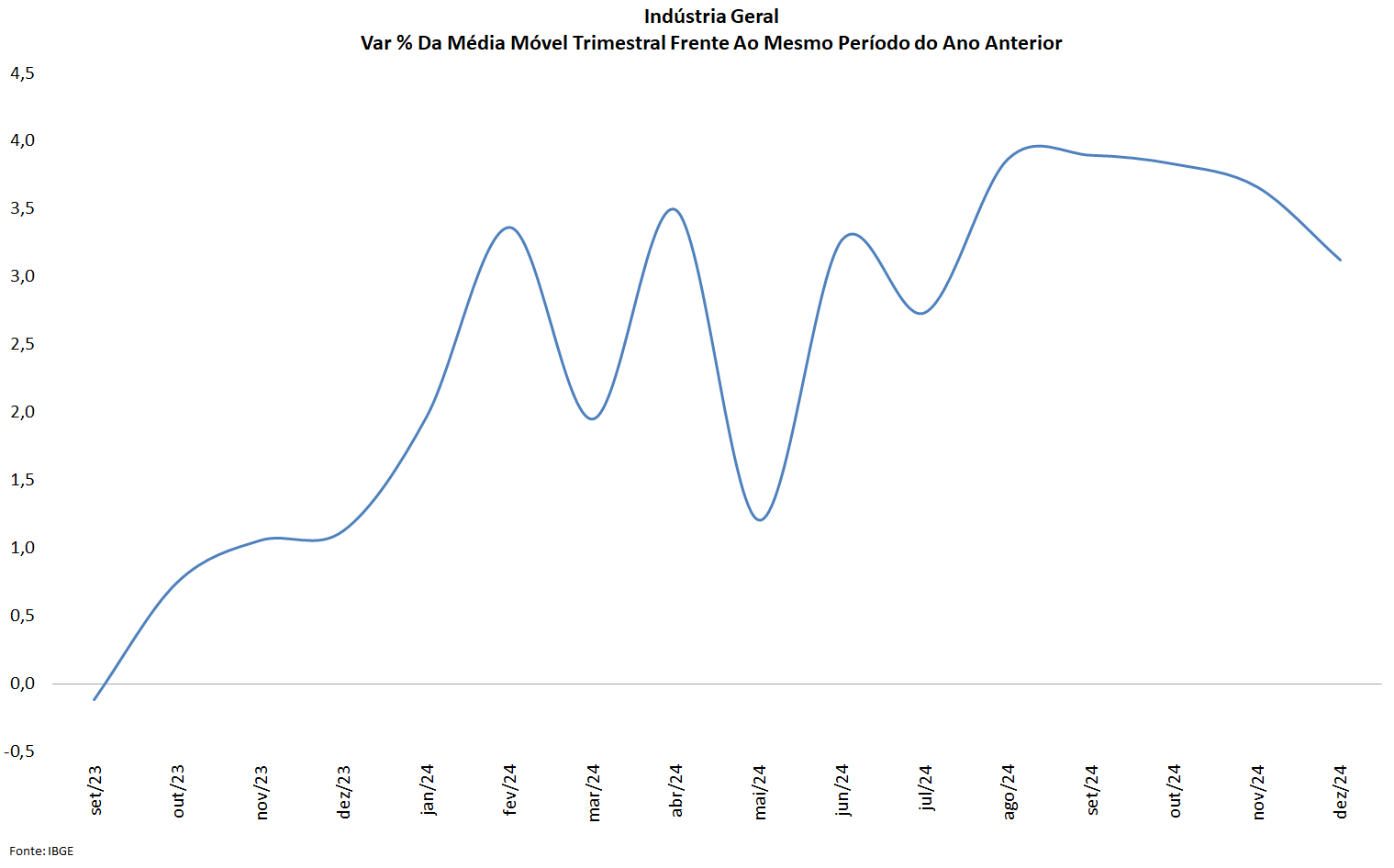 Para o ano como um todo, isto é, em jan-dez/24, o setor industrial apontou crescimento de +3,1%, isto é, bem acima da variação de apenas +0,1% de jan-dez/23.
