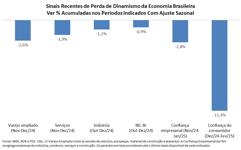 Entre outros indicadores que apontam para um esmorecimento na virada do ano está a confiança dos agentes econômicos. Segundo as pesquisas da FGV, a confiança do consumidor recuou -3,1% em dez/24, -5,1% em jan/25 e -2,6% em fev/24, para o menor nível desde ago/22. Já a confiança empresarial, considerados indústria, comércio, serviços e construção, caiu -0,5% em nov/24, -0,3% em dez/24 e -1,8% em jan/25.