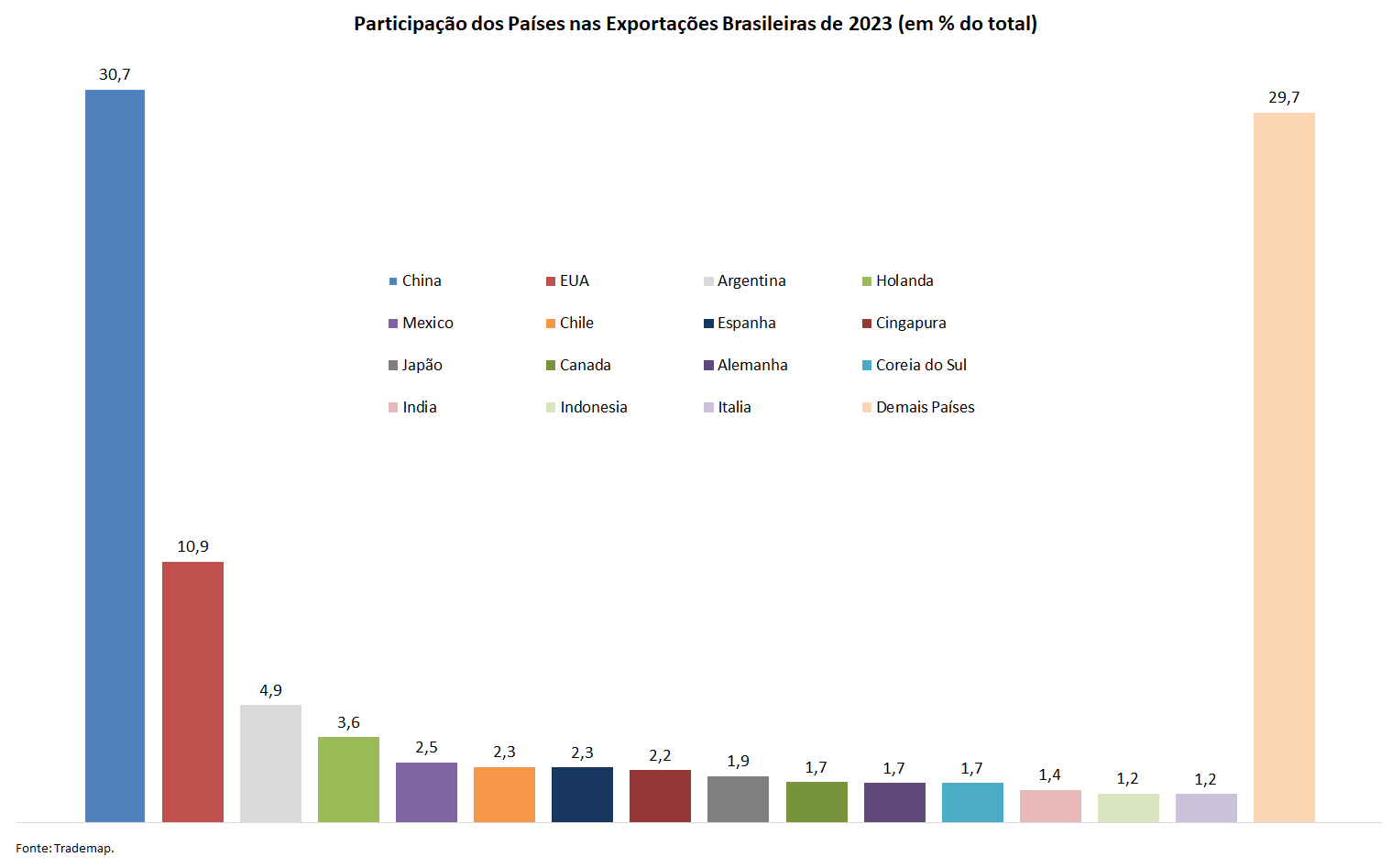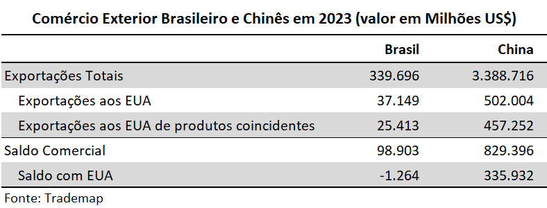 Nesta Carta foram utilizados os dados do TradeMap de 2023 (última informação disponível). Neste ano, os EUA foram o segundo principal destino das exportações brasileiras, respondendo por quase 11% do total. As exportações brasileiras aos EUA somaram US$ 37.149 milhões, sendo US$ 25.413 milhões de produtos em que tanto o Brasil quanto a China exportam para os EUA. No caso da China, que teve uma exportação de US$ 502.004 milhões, US$ 457.252 milhões correspondeu a produtos coincidentes com o Brasil.