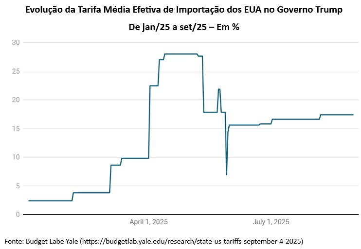 Como resultado a tarifa média efetiva de importação dos EUA saltou de 2,4% em janeiro de 2025 para 17,4% em setembro, segundo o Departamento de Economia da Universidade de Yale. Ou seja, mais de 7 vezes ao logo dos primeiros nove meses deste ano.
