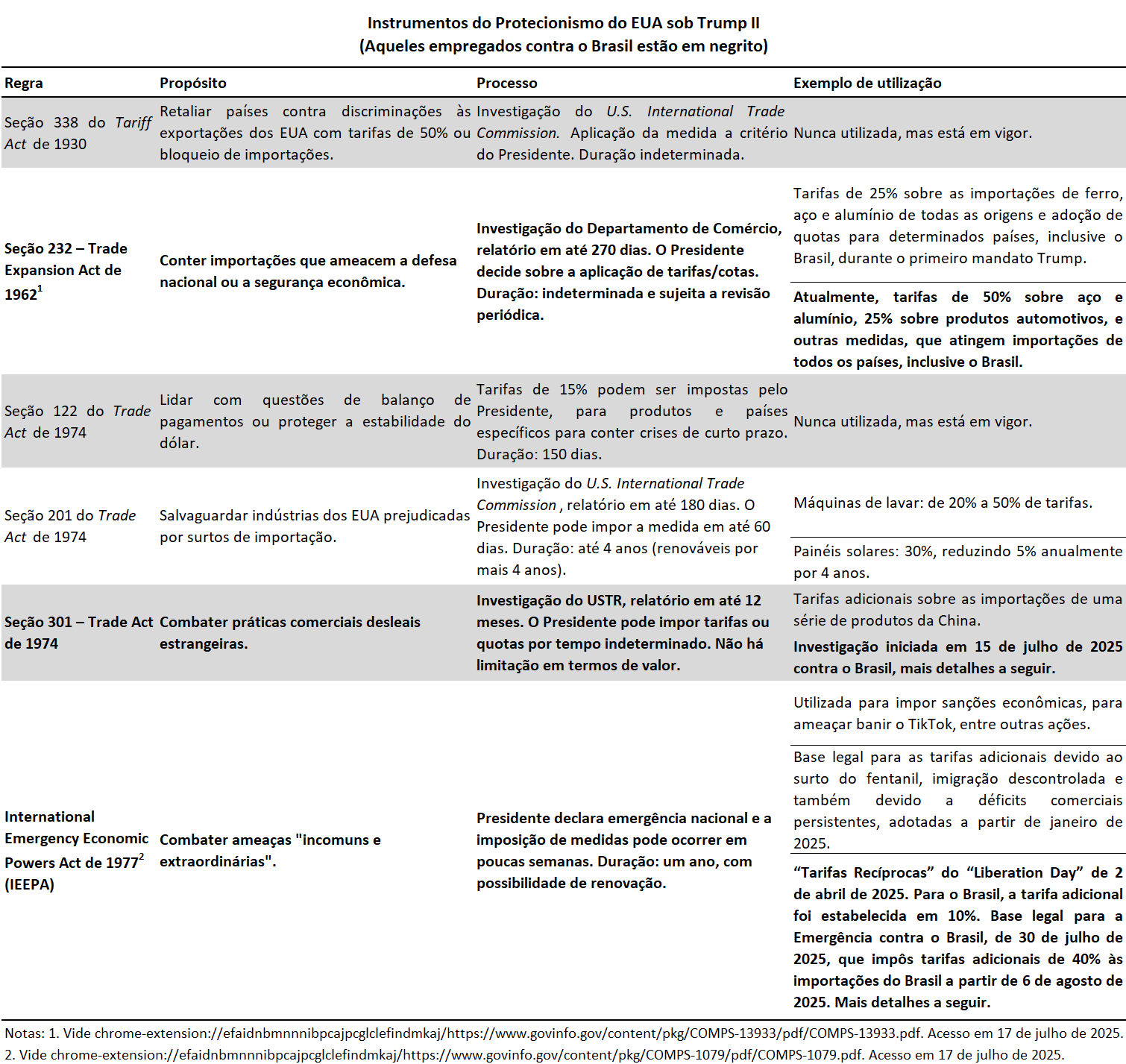 Diversos dispositivos legais amparam a imposição de tarifas pelos EUA, com diferentes objetivos e históricos de uso. Um breve resumo de todos eles é apresentado na tabela a seguir, sendo que aqueles que estão sendo utilizados como base legal para as tarifas atualmente impostas ao Brasil estão destacadas e serão abordadas com maior detalhamento mais à frente.
