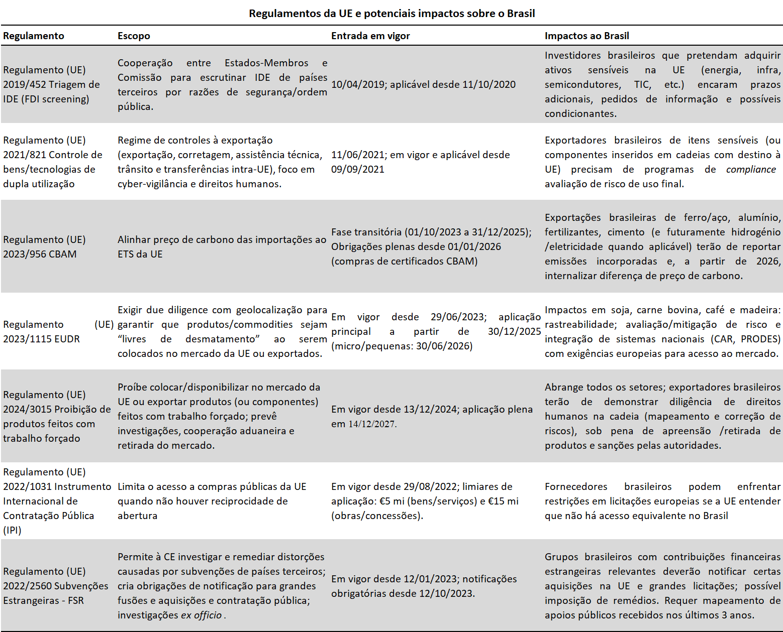 A seguir, são identificados os principais regulamentos usados pela União Europeia como meio de influenciar a nova governança mundial de comércio e investimentos, bem como seus efeitos, notadamente para o Brasil.