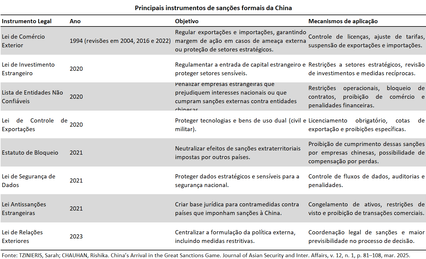 O regime de sanções da China é sustentado por um arcabouço legal robusto, desenvolvido a partir da década de 1990 e significativamente ampliado após 2019, em resposta à intensificação das pressões externas, como a guerra comercial com os Estados Unidos.