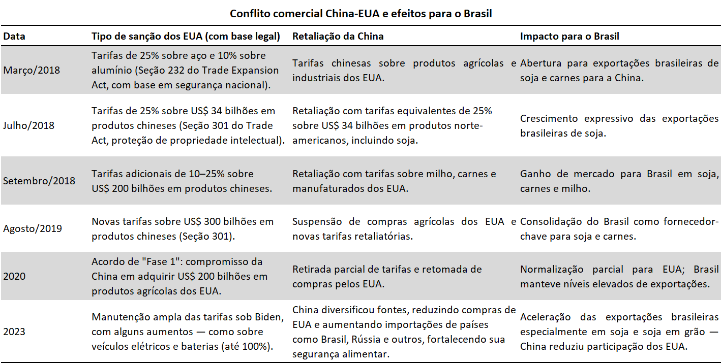 A tabela a seguir consolida os principais episódios de sanções e acordos implementados pelos Estados Unidos contra ou a favor da China entre 2018 e 2024, destacando as medidas de retaliação chinesas e seus efeitos sobre o comércio bilateral Brasil–China.