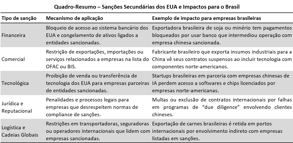 Uma empresa exportadora brasileira que, além de fornecer à China, utilize serviços financeiros em dólares de bancos norte-americanos, pode enfrentar dificuldades se a contraparte chinesa estiver na lista de entidades sancionadas pelo OFAC. O risco é maior para empresas em setores sensíveis.