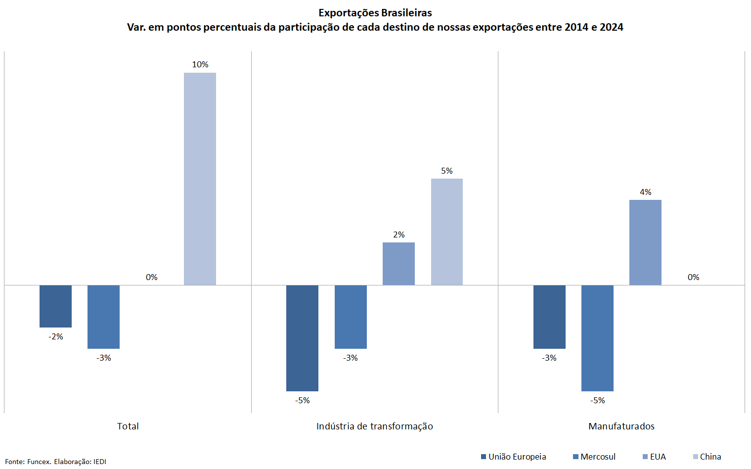 Como discutido na Carta IEDI n. 1328 “As exportações brasileiras e o protecionismo dos EUA”, a União Europeia e o Mercosul foram os dois blocos de países que mais perderam participação na pauta exportadora do Brasil na última década, sobretudo em bens industriais.