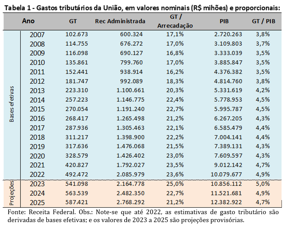 O incremento verificado em duas décadas, da ordem de 1,5 ponto percentual do PIB, equivale a aproximadamente R$ 150 bilhões, valor muito expressivo. Para 2025, estima-se um valor total de R$ 587 bilhões em gastos tributários, ou o equivalente a 21% de toda a receita administrada federal.
