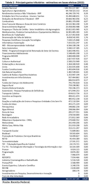 A lista de gastos tributários é bastante ampla, mas mais de dois terços da perda de receita reconhecida pelas projeções oficiais estão concentradas exatamente nos itens identificados acima.