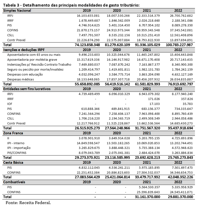 Na tabela acima, os gastos tributários das principais modalidades foram decompostos, identificando precisamente a quais impostos se referem ou, no caso das isenções e deduções do IRPF, a qual dispositivo exato estão relacionadas.