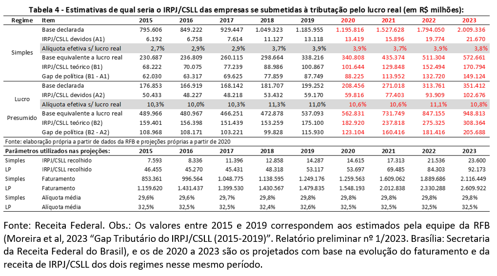 A equipe da Receita Federal, no estudo pioneiro de dimensionamento do chamado Tax Gap, busca estimar qual seria o imposto devido (IRPJ/CSLL) pelas empresas dos nossos dois regimes, do Simples e do Lucro Presumido, caso estivessem submetidas à tributação pelo seu lucro real, com alíquota de até 34% no setor não-financeiro.