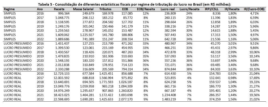 Do relatório do Tax Gap (Moreira et al, 2023 “Gap Tributário do IRPJ/CSLL (2015-2019)”. Relatório preliminar nº 1/2023, Secretaria da Receita Federal do Brasil), obtêm-se as estimativas de Excedente Operacional Bruto (EOB) e de lucro efetivo das empresas do setor não-financeiro por regime de tributação.