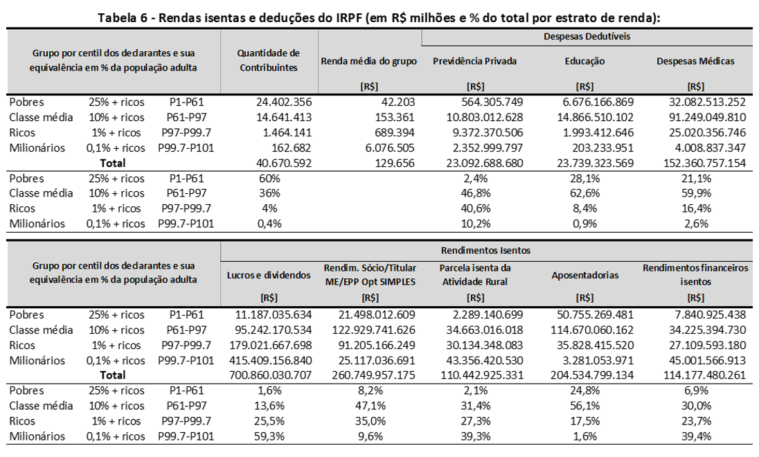 A fração do 0,1% mais rico do Brasil, que representa 0,4% dos contribuintes, tem maior participação nos seguintes tipos de renda ou isenção: 39,3% da parcela isenta do rendimento da atividade rural, 39,4% dos rendimentos financeiros isentos e 59,3% no caso de lucros e dividendos.
