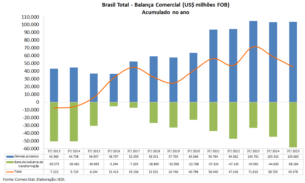 O acumulado até setembro de 2025 registrou saldo comercial positivo de US$ 45,5 bilhões, bem abaixo dos superávits para tal acumulado logrados nos quatro anos anteriores pela série em dólares correntes.