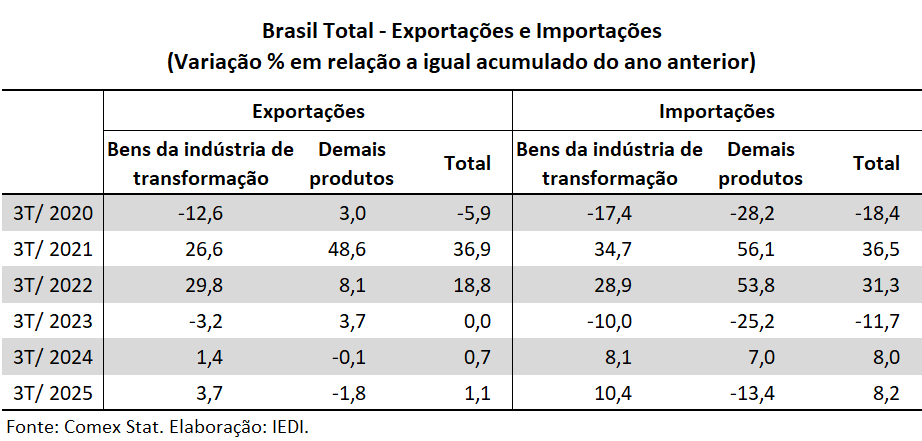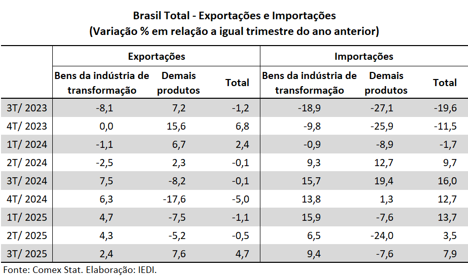 Atendo-se apenas ao terceiro trimestre de 2025, mais afetado pelo tarifaço aplicado pelo governo estadunidense, o saldo positivo da balança comercial brasileira de US$ 15,7 bilhões ficou abaixo tanto do segundo trimestre, quanto do superávit obtido em julho-setembro dos dois anos anteriores. As exportações brasileiras do período de julho-setembro de 2025 avançaram +4,7%, frente ao terceiro trimestre de 2024, chegando a US$ 92,2 bilhões. As importações cresceram a um ritmo superior (+7,9%), atingindo US$ 76,5 bilhões.