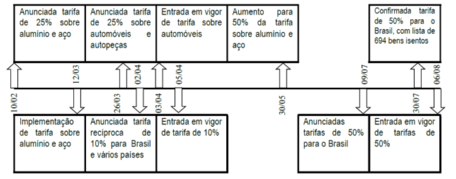 A linha do tempo a seguir explicita várias das medidas adotadas ao longo de 2025 pelo governo estadunidense, até a recente isenção do adicional de tarifa para alguns produtos adicionais importados do Brasil.