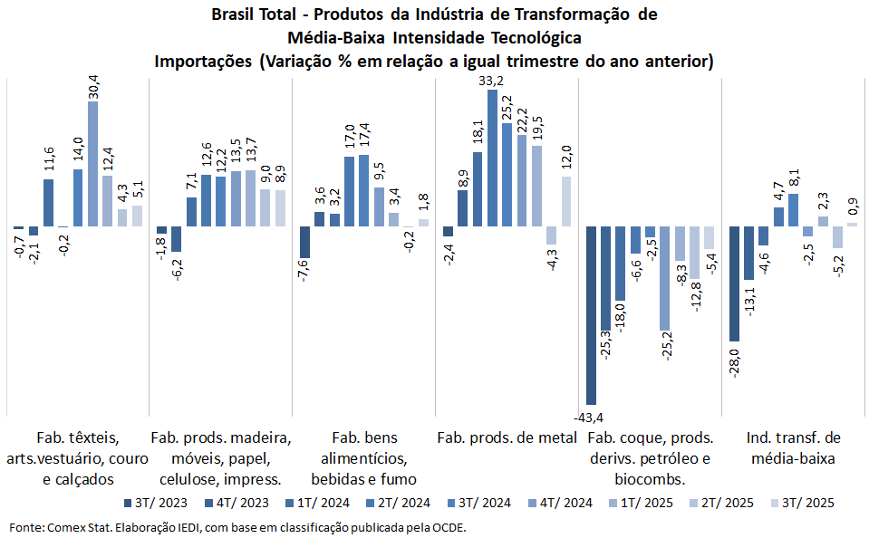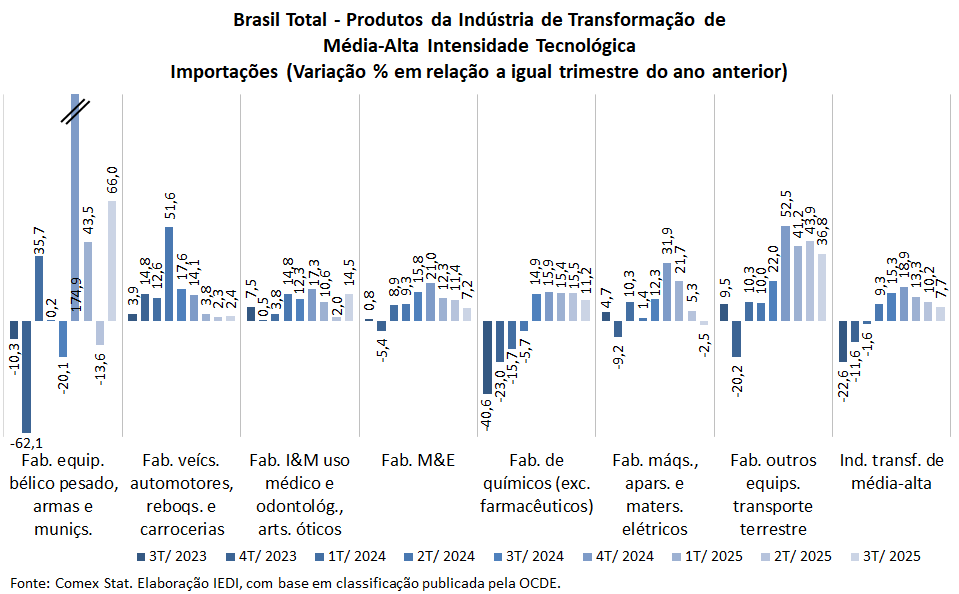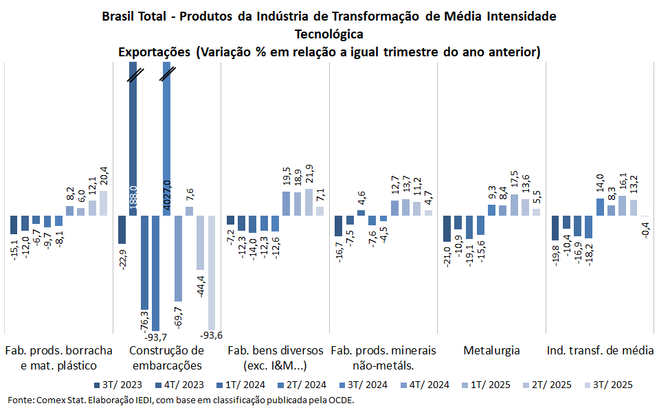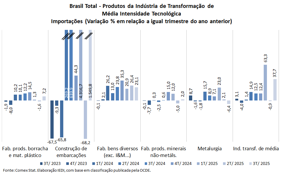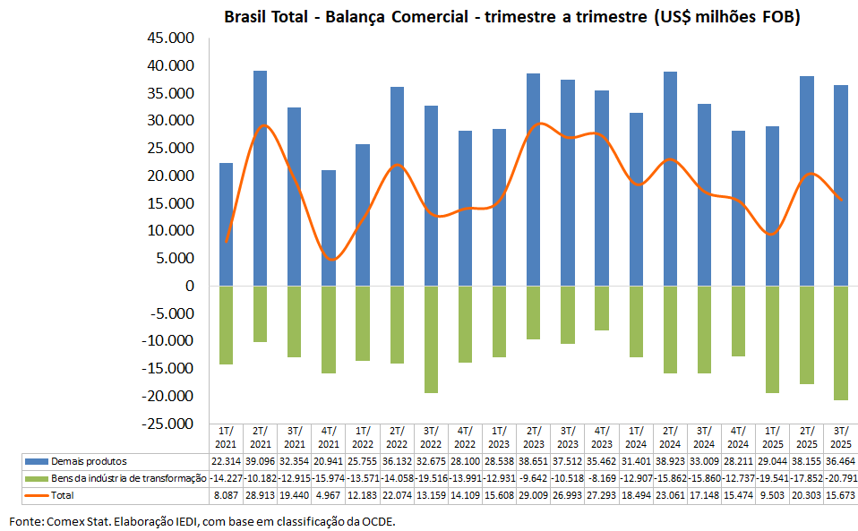 Quanto aos bens típicos da indústria de transformação, suas exportações cresceram +2,4% em relação ao mesmo trimestre do ano anterior, chegando a US$ 50,0 bilhões. Suas importações aumentaram +9,4%, para US$ 70, bilhões. Tais grandezas no trimestre em questão foram as maiores para trimestres convencionais da série em dólares correntes. Assim, o déficit aumentou de US$ 15,9 bilhões em julho-setembro de 2024 para US$ 20,8 bilhões no terceiro trimestre de 2025.