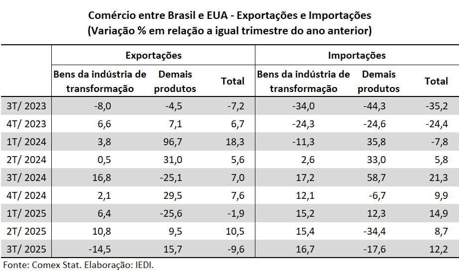 O intercâmbio de mercadorias entre Brasil e EUA, no acumulado até setembro de 2025, registrou déficit comercial brasileiro de US$ 5,1 bilhões, enquanto o saldo deficitário de produtos tipicamente oriundos da indústria de transformação com esse país foi de US$ 7,8 bilhões, mais que dobrando frente ao ano anterior.