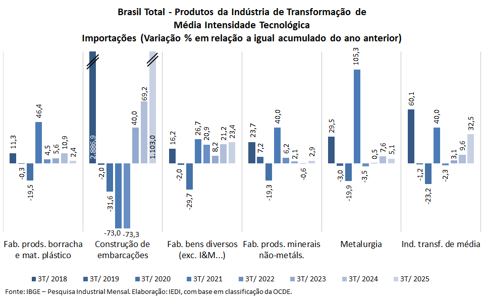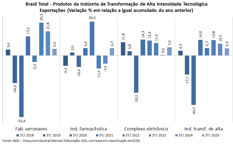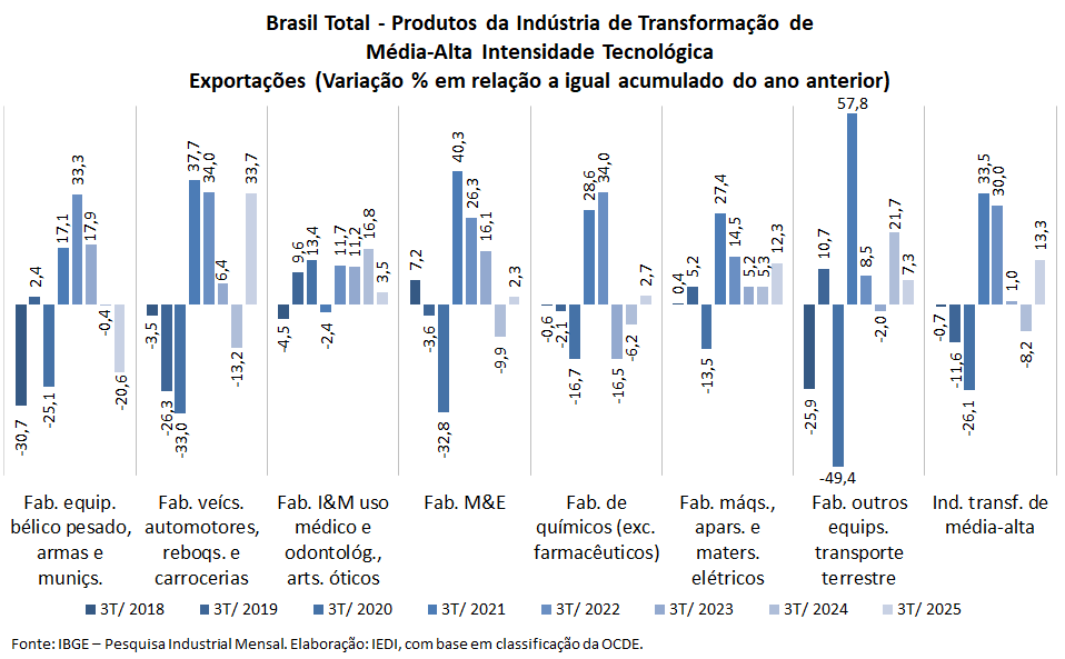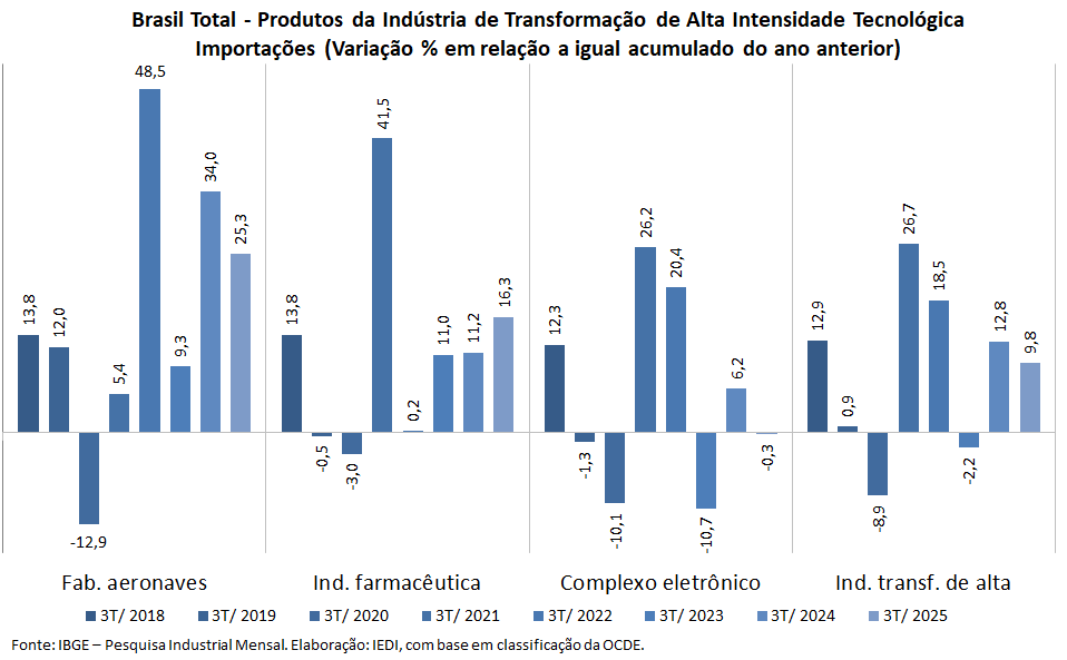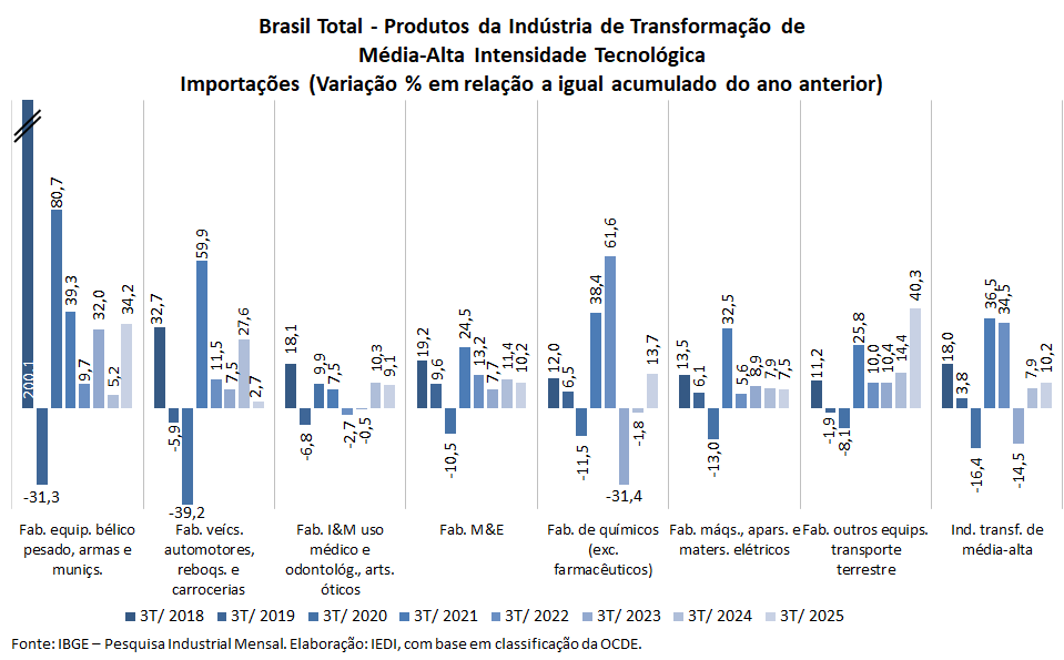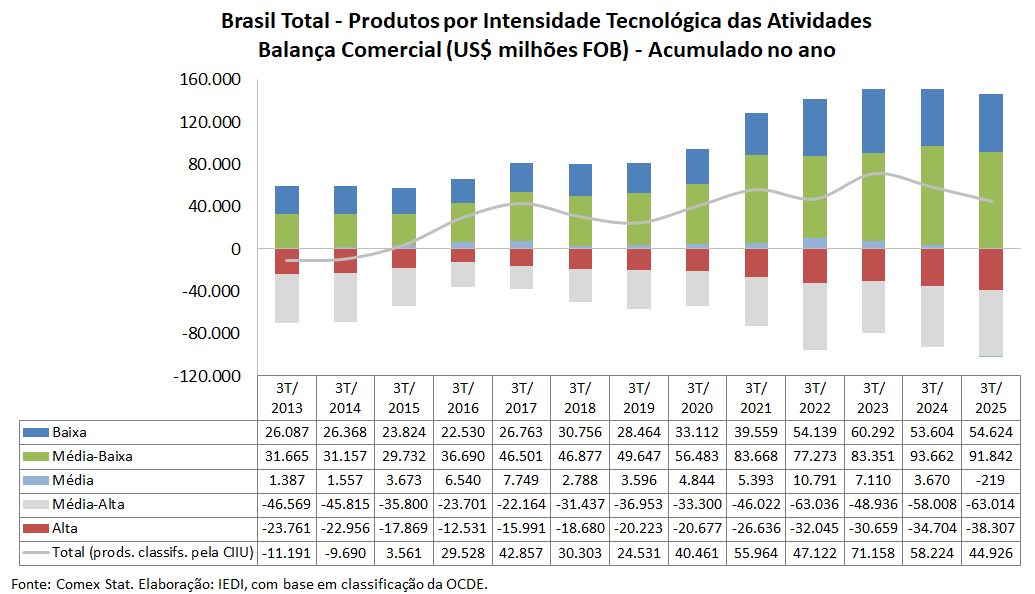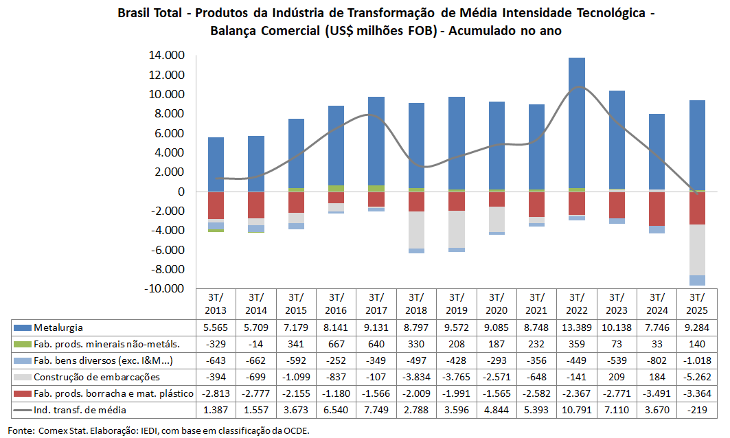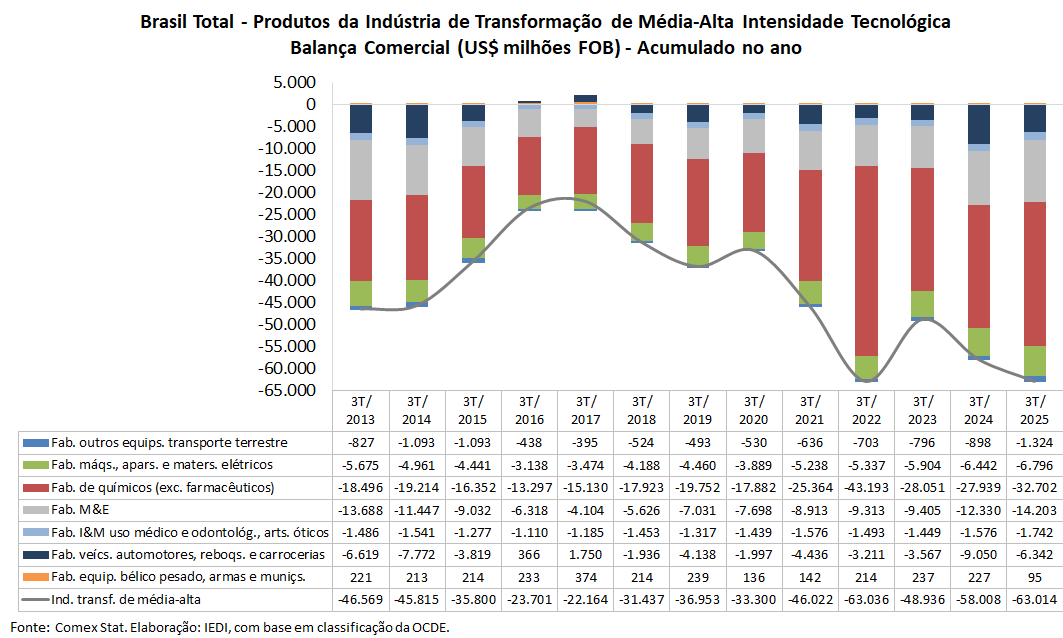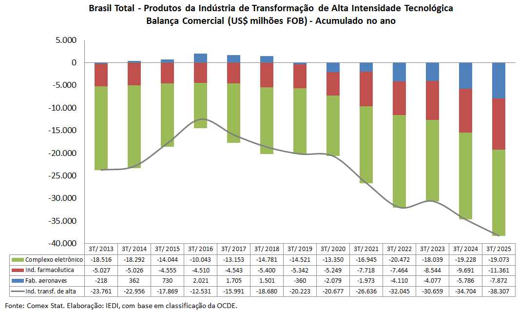 No acumulado até setembro de 2025, o déficit dos produtos da indústria de transformação de alta intensidade cresceu frente a igual período de 2024, para US$ 38,3 bilhões, o maior déficit da série em dólares correntes para tal acumulado.