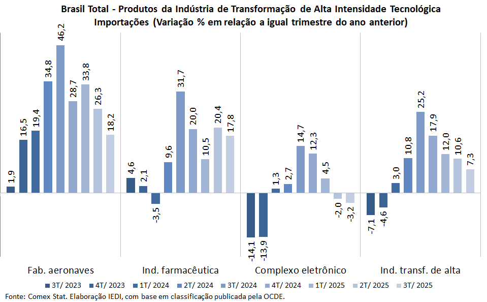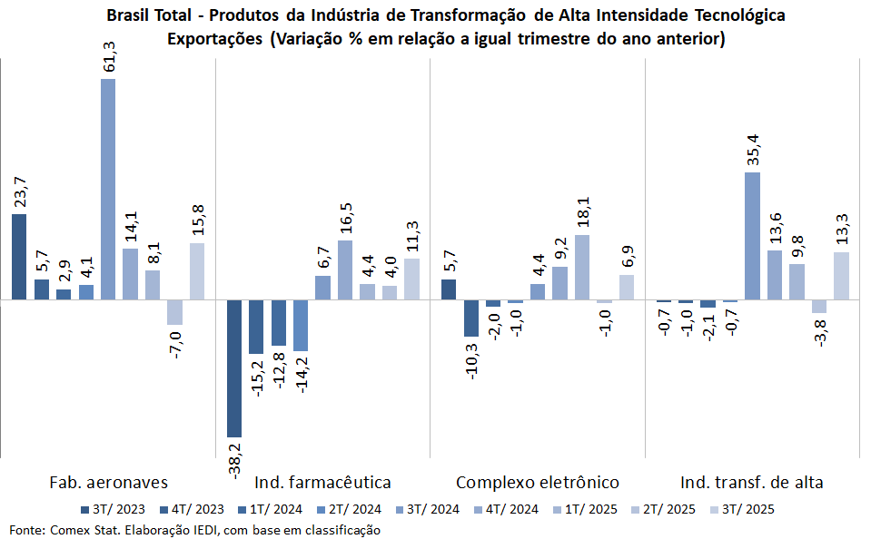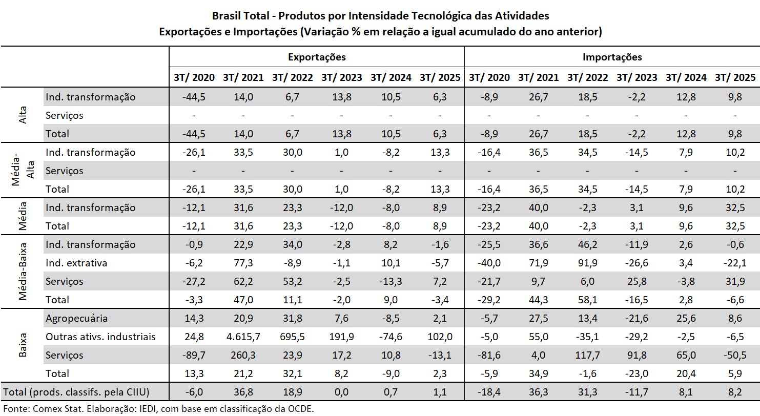 Em julho-setembro, a balança dos produtos das indústrias de alta intensidade ficou deficitário em US$ 13,1 bilhões, superando o déficit do trimestre correspondente de 2024. Suas exportações avançaram 13,3%, chegando a US$ 2,4 bilhões. As importações, a seu turno, cresceram 7,3%, mas sobre uma base bem maior, atingindo assim US$ 15,5 bilhões.
