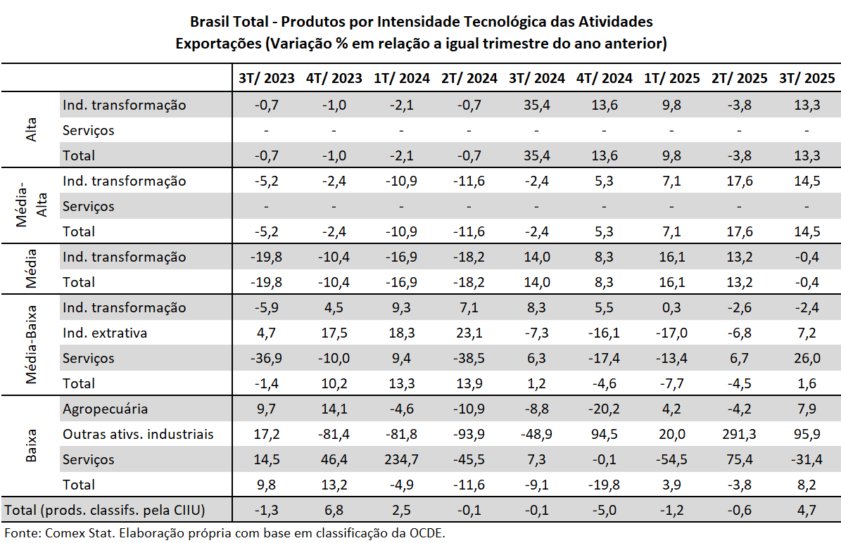 Outra faixa a também encolher exportações foi o de média-alta tecnologia: -7,6% ante o 3º trim/24, mas a intensidade não chama atenção, já que foi menor do que a do 1º trim/25 (-14,2%). Cabe observar, contudo, que alguns produtos que a compõem pioraram muito seu desempenho.