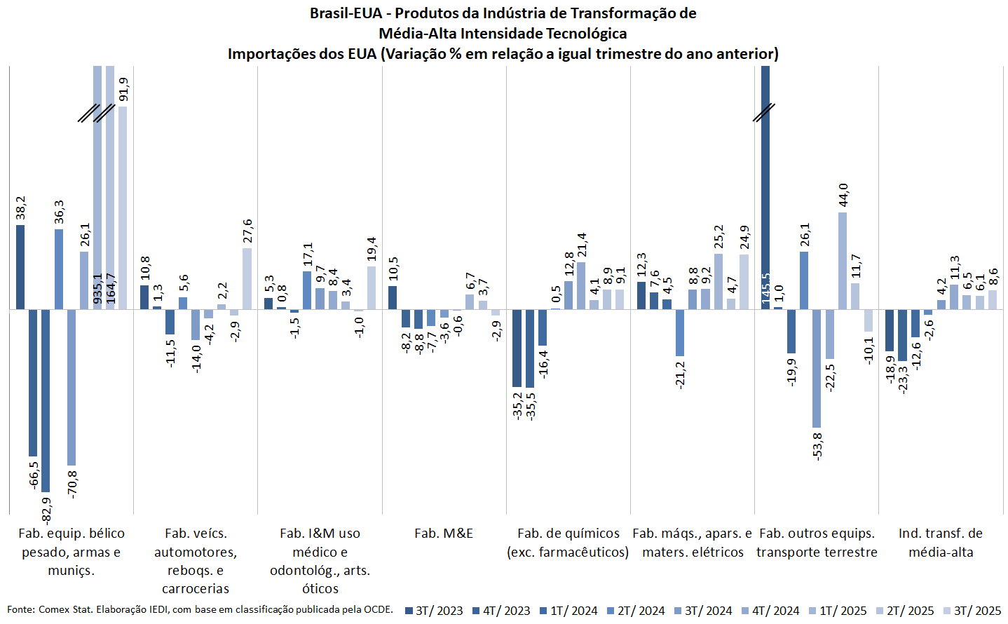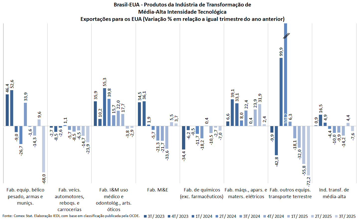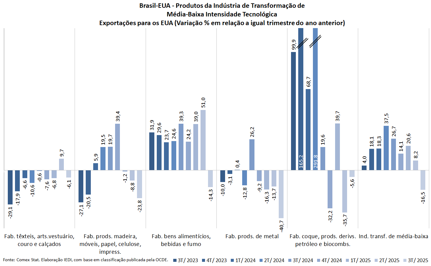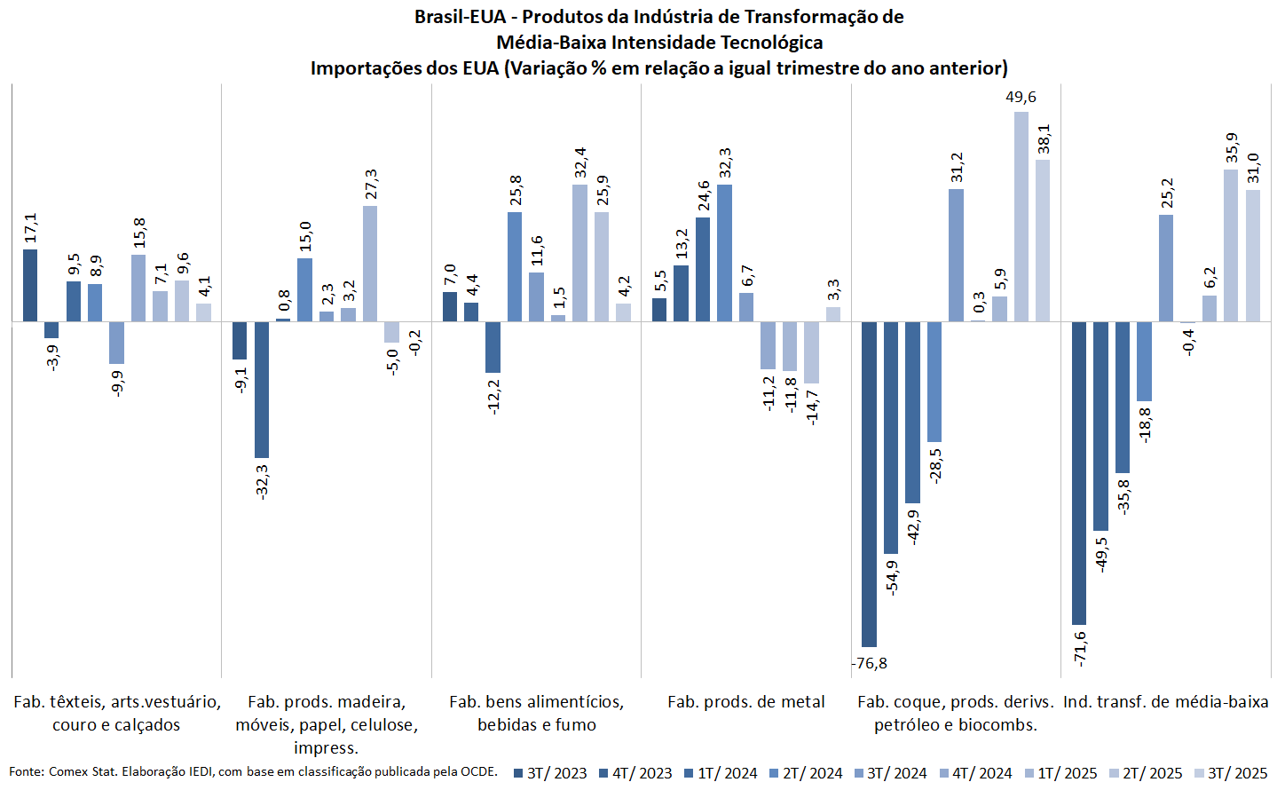 No mesmo período, o país exportou para os EUA US$ 2,5 bilhões de bens de média-baixa intensidade tecnológica, apresentando queda muito maior que o total das exportações dessa faixa de bens (-16,5%) e as importações desses produtos dos EUA chegaram a US$ 2,4 bilhões (+31,0%). Dessa forma, o superávit com os EUA ficou em US$ 167 milhões em julho-setembro, em contraste com o saldo positivo bilionário do mesmo período de 2024 e dos demais trimestres desde o terceiro de 2023.