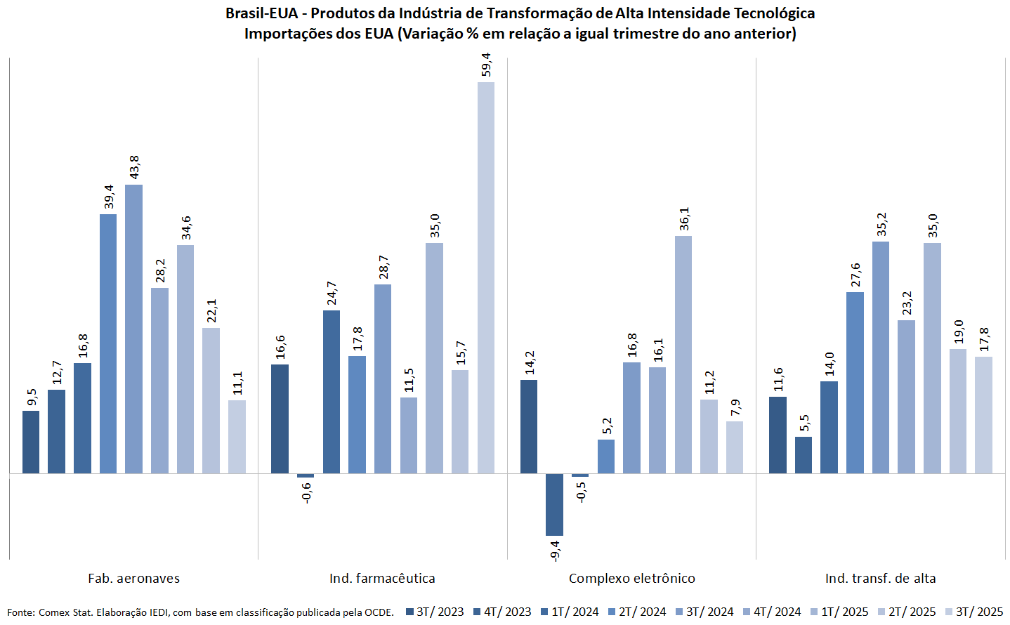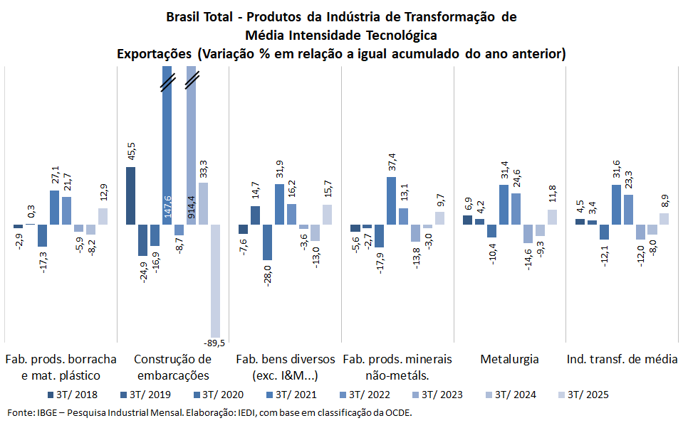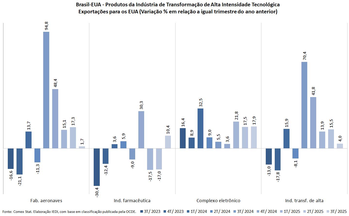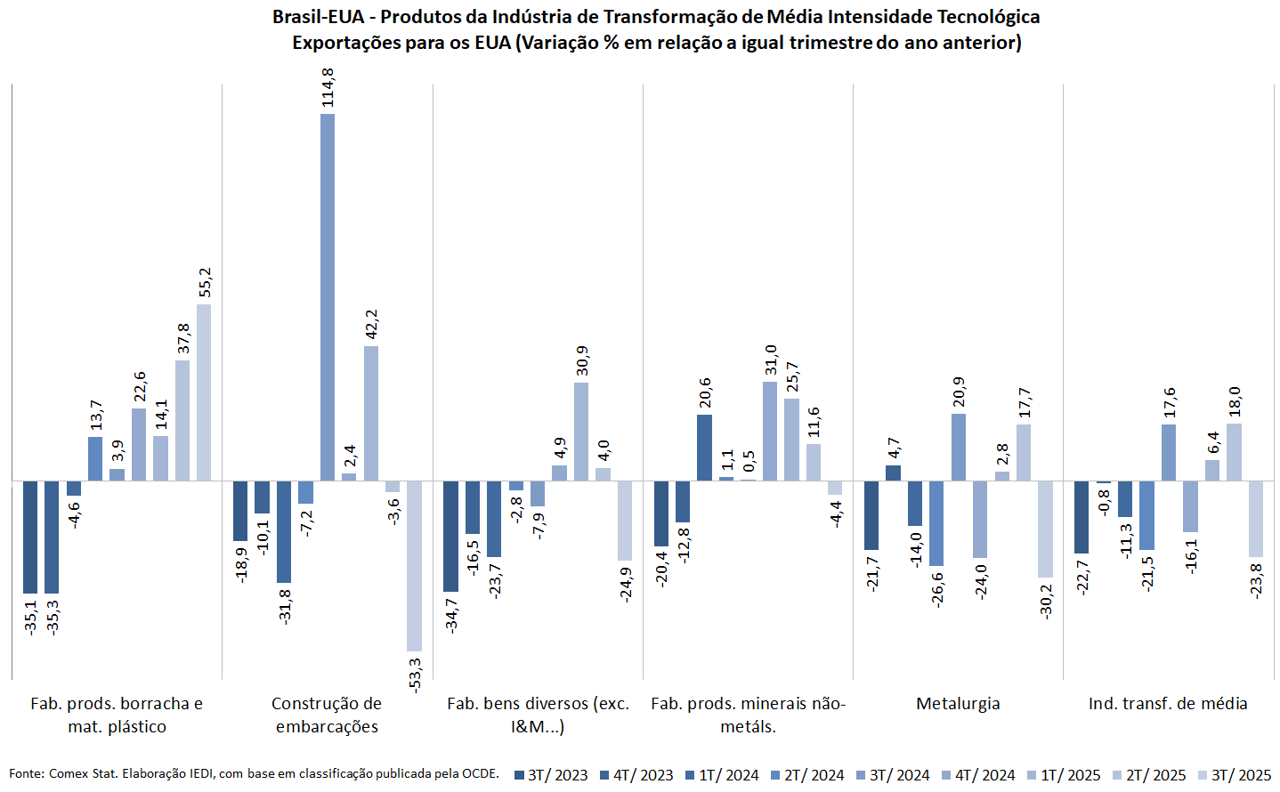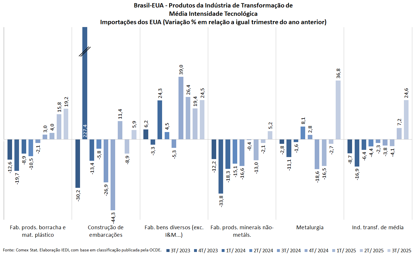 No mesmo período, o país exportou para os EUA US$ 2,5 bilhões de bens de média-baixa intensidade tecnológica, apresentando queda muito maior que o total das exportações dessa faixa de bens (-16,5%) e as importações desses produtos dos EUA chegaram a US$ 2,4 bilhões (+31,0%). Dessa forma, o superávit com os EUA ficou em US$ 167 milhões em julho-setembro, em contraste com o saldo positivo bilionário do mesmo período de 2024 e dos demais trimestres desde o terceiro de 2023.