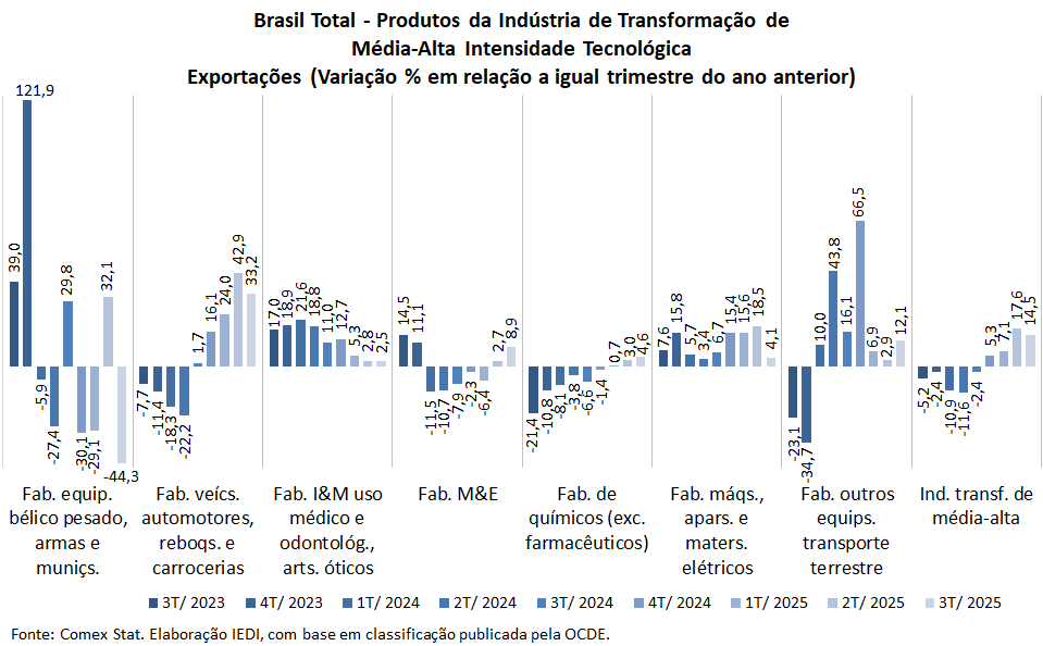 É o caso de veículos (-6,5% em jan-mar; -14,7% em abr-jun e -68% em jul-set/25), mas também é o caso dos setores produtores de outros equipamentos de transporte terrestres (-32%; -55,8% e -72,2%), equipamento bélico, armas e munições (-14,3%; +9,6% e -68%) e produtos químicos (-10,5%; -2,5% e -7,0%).