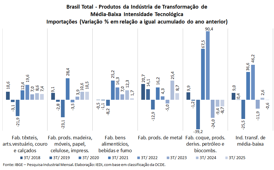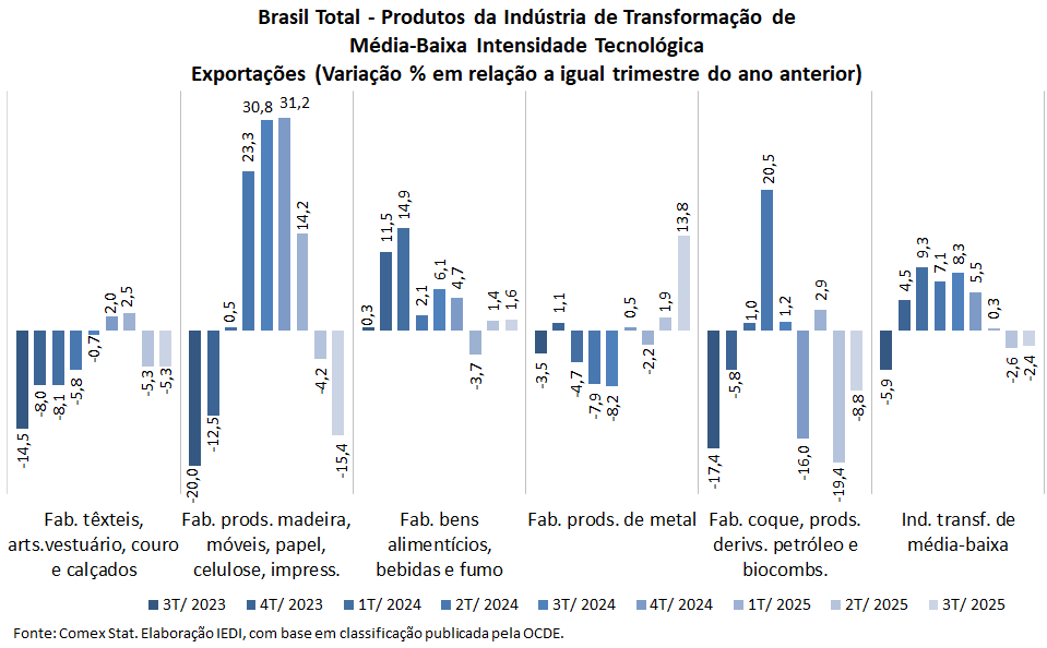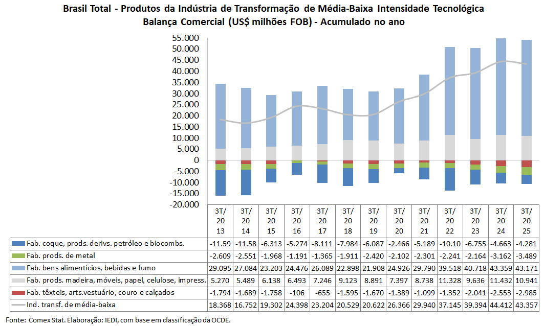 O saldo de tais produtos registrou superávit de US$ 43,4 bilhões, só aquém do acumulado equivalente de 2024. As exportações de mercadorias produzidas pela indústria de transformação de média-baixa intensidade tecnológica diminuíram 1,6% na comparação entre acumulados até setembro de 2025 e 2024, ficando em US$ 75,6 bilhões. Apesar da retração, para janeiro-setembro do ano na série em dólares correntes, só ficou atrás do recorde atingido em 2024. As importações também retrocederam 0,6%, ficando em US$ 23,7 bilhões.
