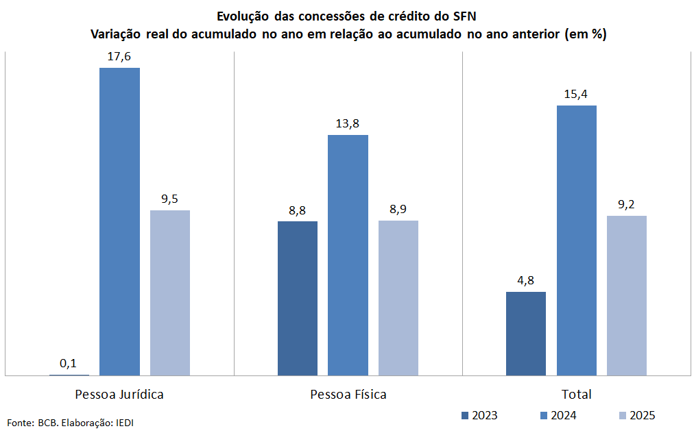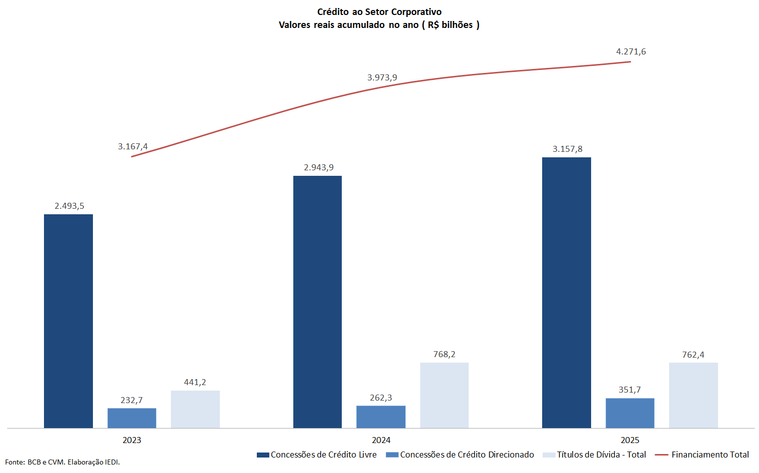 No acumulado do ano, a contratação de crédito novo neste conceito ampliado alcançou R$ 4,3 trilhões ao setor corporativo, com variação real de 7,5% frente ao acumulado no ano de 2024. Esse resultado foi impulsionado pela expansão das concessões do SFN às empresas (9,5%), que mais do que compensou a queda real no volume anual dos montantes captados com emissão de títulos de dívida (-0,8%) na base de comparação interanual.
