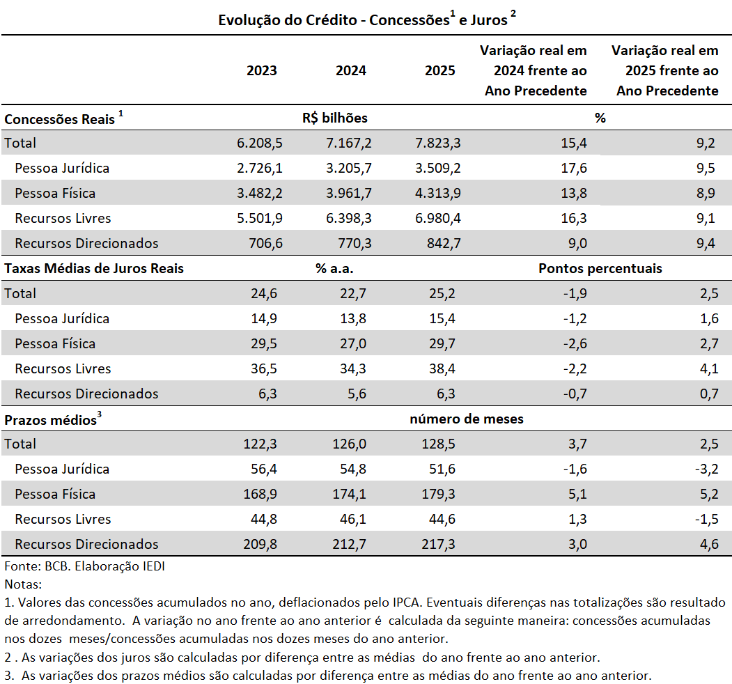 Os empréstimos novos, isto é, as concessões de crédito realizadas pelo Sistema Financeiro Nacional, registraram desaceleração em relação a 2024, de +15,4% para +9,2% em termos reais, condicionada por aquela fração denominada operações “livres” pelo Banco Central, que reagem mais diretamente às mudanças na condução da política monetária.