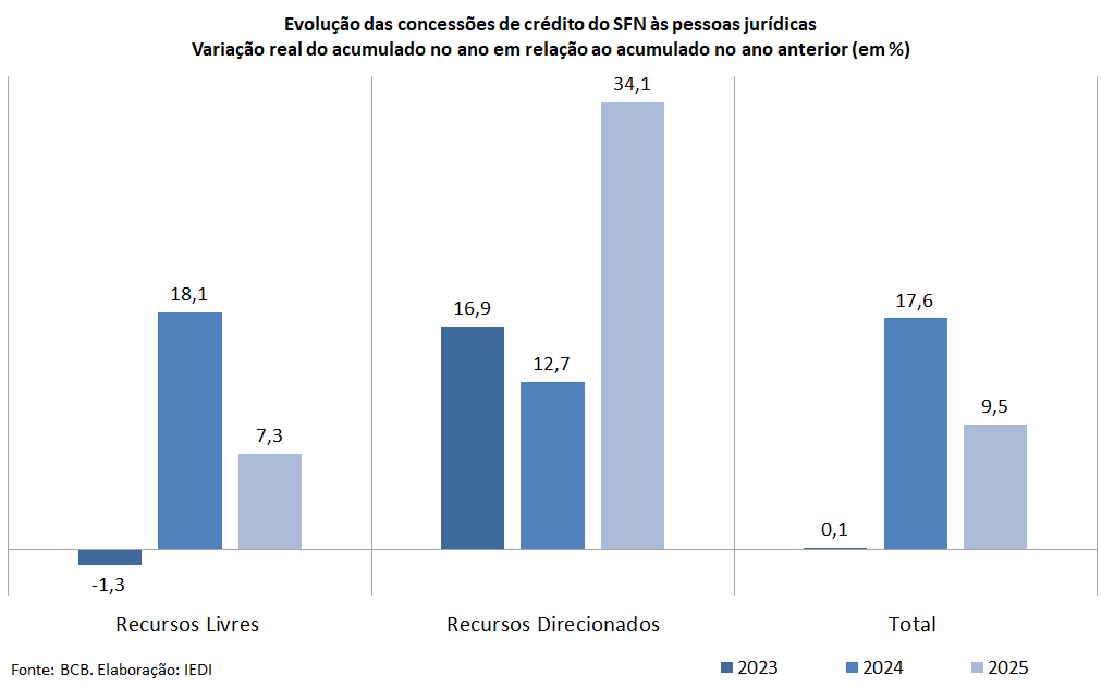No segmento de crédito direcionado, as novas concessões acumuladas no ano de 2025 registram alta de 9,4% em termos reais, refletindo a vigorosa expansão das operações com as empresas (34,1%), puxada pelas novas concessões do BNDES e pelos novos financiamentos do âmbito do Programa Nacional de Apoio às Microempresas e Empresas de Pequeno Porte (Pronampe), cujo limite de crédito por empresa foi elevado a R$ 250 mil em 2025, e do Programa Emergencial de Acesso ao Crédito (FGI Peac).