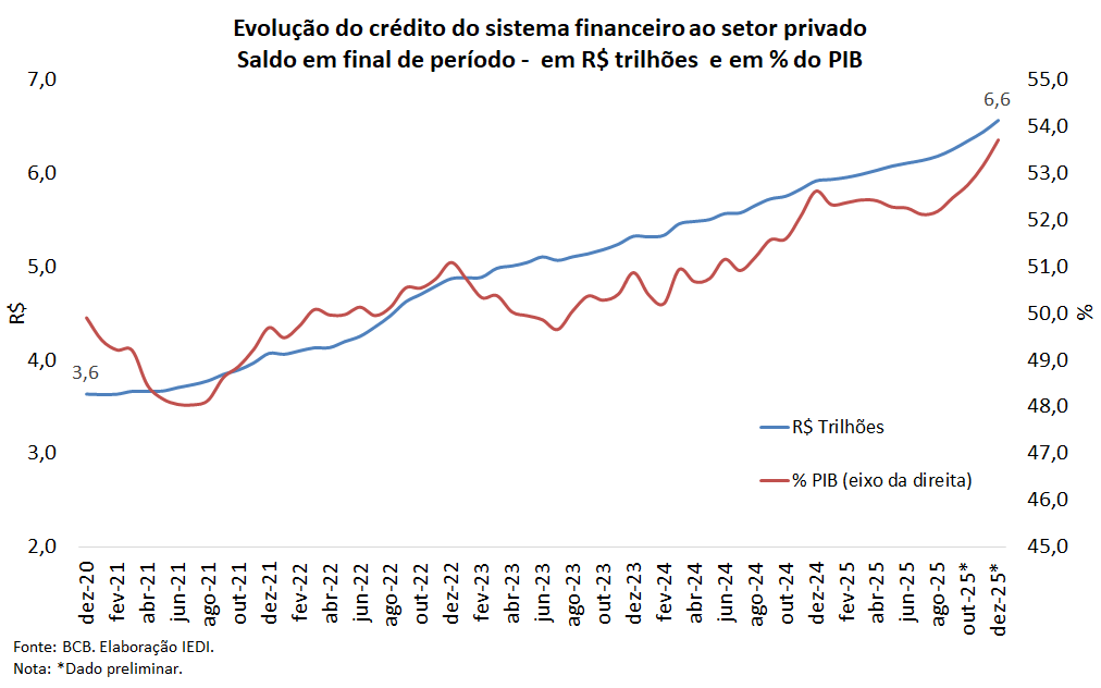 [I1.1]A análise dos dados de concessão de crédito bancário do BCB em conjunto com os dados divulgado pela CVM sobre a emissão pública de títulos de dívida – no Boletim Econômico, Ano 13, volume 108, 4º Trimestre de 2025, 02/02/2026, pág. 21 – permite verificar o volume do crédito ampliado novo (isto é, do fluxo) que foi captado em 2025.