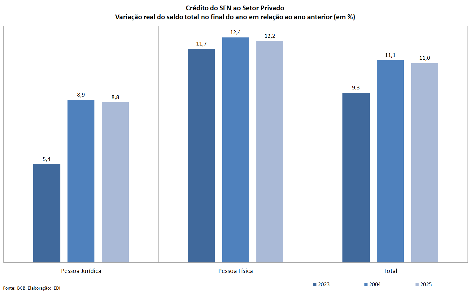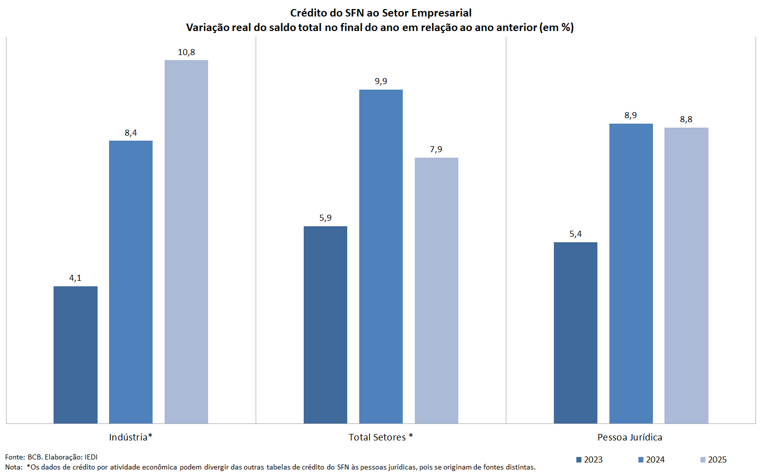 Desse modo, em 2025, a elevação do estoque do crédito concedido à indústria foi superior à verificada tanto para o conjunto dos setores por atividade econômica como para o setor empresarial, invertendo a tendência observada nos anos anteriores.