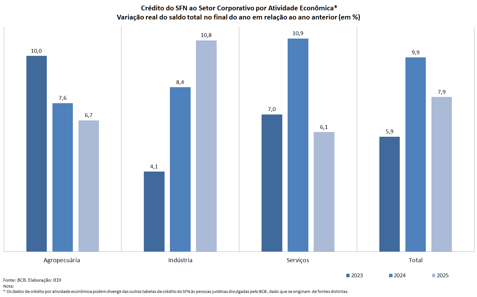 No recorte do crédito do SFN às empresas por atividade econômica, o setor industrial foi único que registrou aceleração no ritmo de crescimento em 2025, registrando variação real no saldo de 10,8%, com avanço de 2,4 p.p., em relação ao ano anterior. Em consequência dessa intensificação, esse setor elevou para 38,0% sua participação no saldo total de crédito corporativo por setor de atividade.
