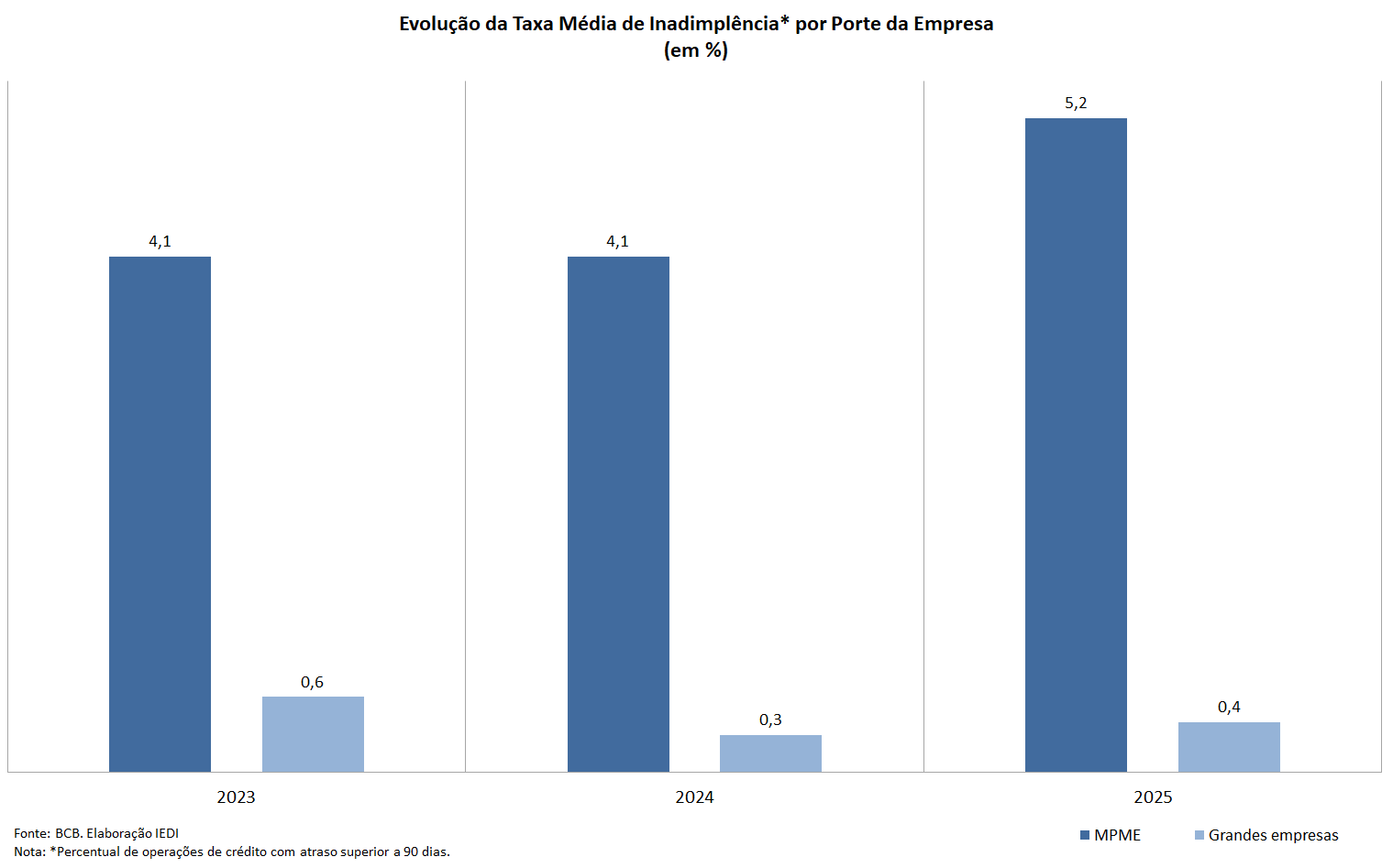 Enquanto a taxa média de inadimplência das empresas de pequeno e médio porte (MPME) subiu para 5,2% em 2025 (alta de +1,1 p.p. ante a 2024), a taxa média de inadimplência para as grandes empresas registrou incremento de apenas +0,1 p.p., passando de 0,3% em 2024 para 0,4% em 2025.