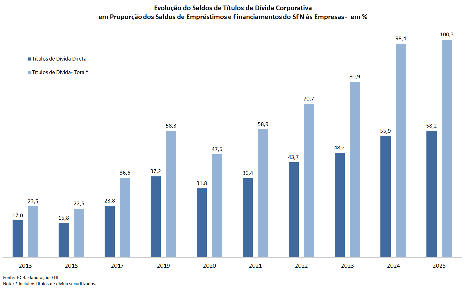 Em termos proporcionais, o saldo de títulos de dívida direta no mercado de capital doméstico atingiu, em 2025, o equivalente a 58,2% dos saldos dos empréstimos bancários às empresas (ante 17% em 2013). Se for considerado o volume total de títulos de dívida, que inclui os títulos securitizados, essa proporção ultrapassa 100% em 2025.