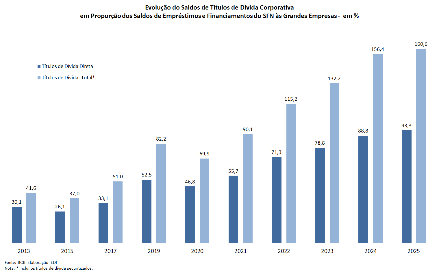 Considerando apenas os saldos de empréstimos e financiamento às grandes empresas, essas proporções são ainda mais elevadas, atingindo: 93% do estoque total de títulos de dívida direta e 160% do estoque total de títulos de dívida.