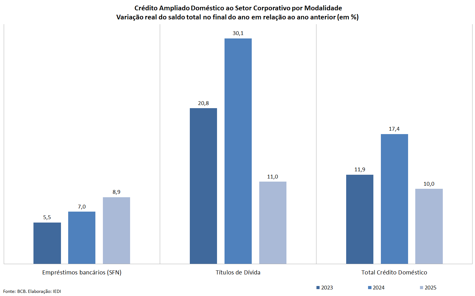 A maior ampliação dos estoques de crédito ao setor industrial em 2025, em termos comparativos, resulta igualmente da maior capacidade das empresas industriais – em média de maior porte – de acessar o mercado de crédito bancário em substituição parcial ao mercado de capitais para atender suas necessidades persistentes de financiamento de capital de giro e capital fixo.