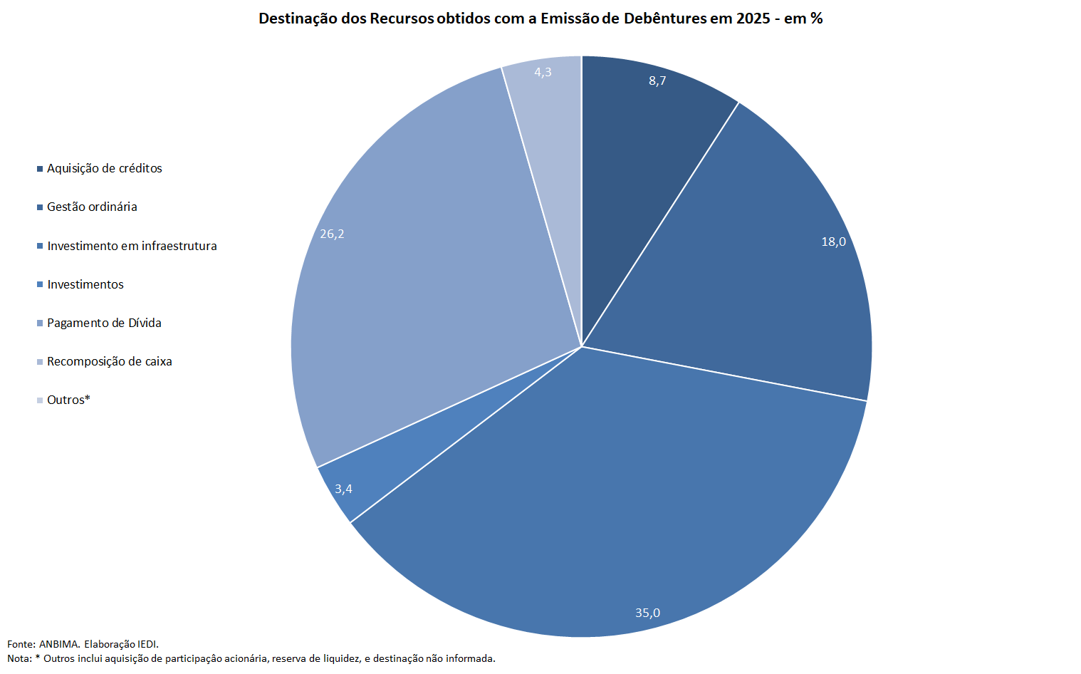 Segundo os dados do Boletim de Mercado de Capitais da Associação Brasileira das Entidades dos Mercados Financeiro e de Capitais (ANBIMA) – cujas estatísticas apresentam algumas diferenças metodológicas em relação às da CVM –, as principais destinações para os recursos obtidos pelas empresas via emissão de debêntures foram: investimento em infraestrutura (35%), pagamento de dívida (26,2%), gestão operacional (18%).