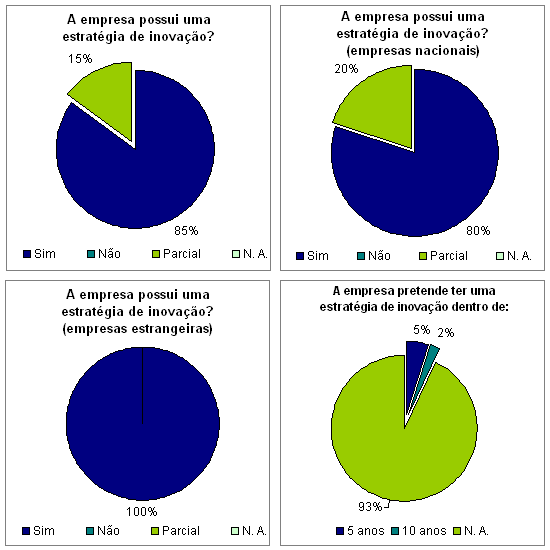 Apenas 13% do total dos entrevistados — cinco grupos empresariais nacionais, que correspondem a 17% das empresas nacionais consultadas — afirmam possuir estratégia parciais de inovação. São grupos que atuam nos setores de construção pesada, siderurgia e metal-mecânica. Dentre estes cinco grupos, dois afirmam que pretendem ter uma clara estratégia definida no horizonte de cinco anos e um grupo afirma desejar tê-la no prazo de dez anos.