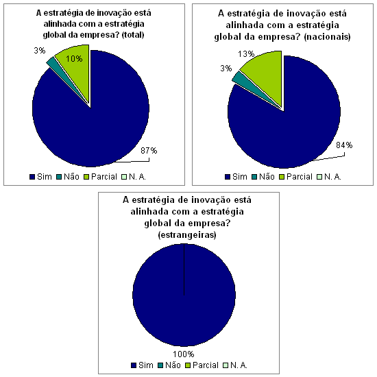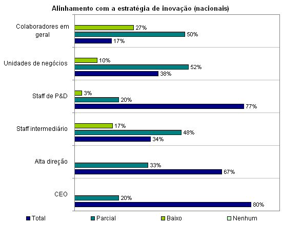 No subconjunto de empresas nacionais, cerca de 1/4 - que a estratégia de inovação não está perfeitamente alinhada com sua estratégia global. Em alguns casos, isso ocorre porque a empresa não possui estratégia de inovação, em outros porque este alinhamento é apenas parcial. Novamente aqui se destacam empresas dos setores da construção pesada, da siderurgia e da metal-mecânica.