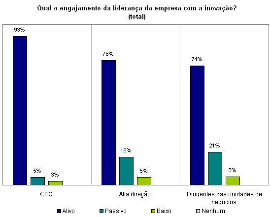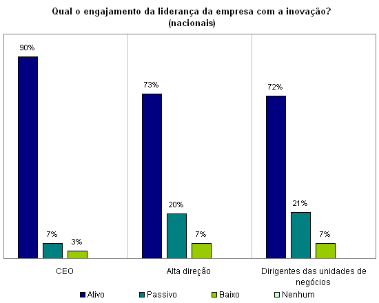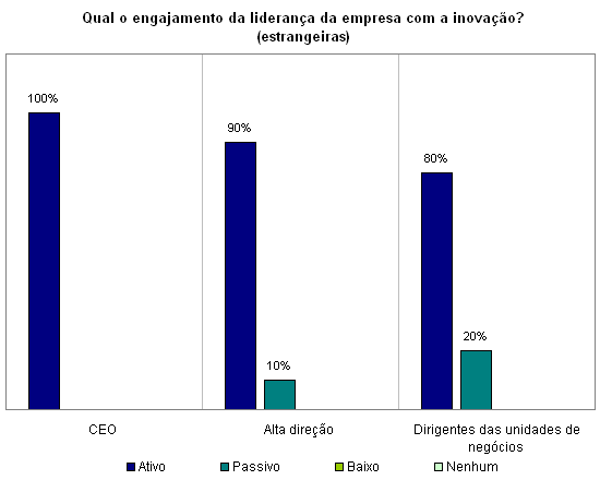 Envolvimento da Liderança da Empresa com a Estratégia de Inovação. Na visão de seus principais dirigentes, o engajamento da alta direção das empresas com a estratégia de inovação é alto, mas variável. O envolvimento do principal executivo é considerado muito ativo em todas as subsidiárias estrangeiras e em 90% dos grupos nacionais. O conjunto da alta direção da empresa se envolve de forma ativa em 73% dos casos de empresas nacionais e em 90% das estrangeiras. No caso dos responsáveis por unidades de negócios, este mesmo percentual é 72% para as nacionais e de 80% para as estrangeiras. Ou seja, os principais executivos consideram elevado seu engajamento com a estratégia de inovação, mas, por vezes, percebem como passivo (18%) ou baixo (5%) o engajamento dos demais níveis da alta direção de suas empresas.