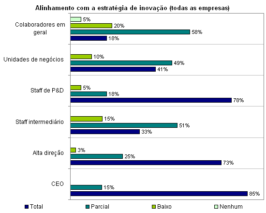 Este percentual declina muito, quanto mais afastado está o segmento da empresa do nível decisório ou das atividades de P&D. Para os CEOs, em apenas 73% dos casos há perfeito alinhamento com a alta direção; em menos da metade das entrevistas se reconheceu perfeito alinhamento com as unidades de negócios. Mais relevante ainda é que, no caso do staff intermediário e dos colaboradores em geral, a resposta mais frequente é de um alinhamento apenas parcial com a estratégia de inovação. E não são pequenos os percentuais declarados de baixo ou nenhum alinhamento com a estratégia de inovação do grupo ou empresa.
