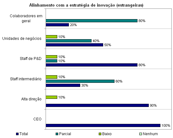 Alinhamento Entre a Estratégia de Inovação e a Estratégia Empresarial. Também para um grande número de grupos empresariais, a estratégia de inovação está claramente alinhada com a estratégia global da empresa. Isso ocorre para 82% do total dos entrevistados, a exemplo de todas as subsidiárias de empresas estrangeiras consultadas. Mas, algumas empresas reconhecem que este alinhamento não é perfeito, o que ocorre, inclusive, até mesmo entre as empresas que declaram ter estratégias claras de inovação.