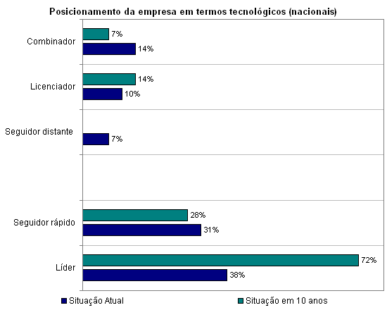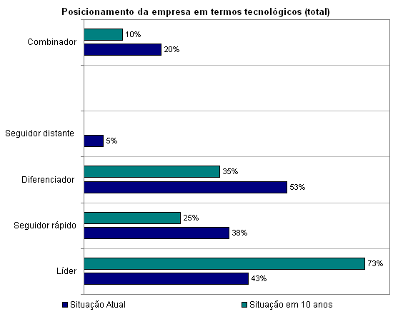 Ao lado da liderança tecnológica, no momento atual predominam — as respostas admitem multiplas opções, em função das distintas áreas de atuação das empresas — situações em que as empresas são também diferenciadoras, seguidores rápidos (fast follower) ou combinadores de soluções. Em dez anos estes posicionamentos dão espaço para a busca da liderança tecnológica, mas não deixam de ser relevantes, evidenciando que a estratégia das empresas seja combinar diversos tipos de posicionamento, conforme sua área de atuação.